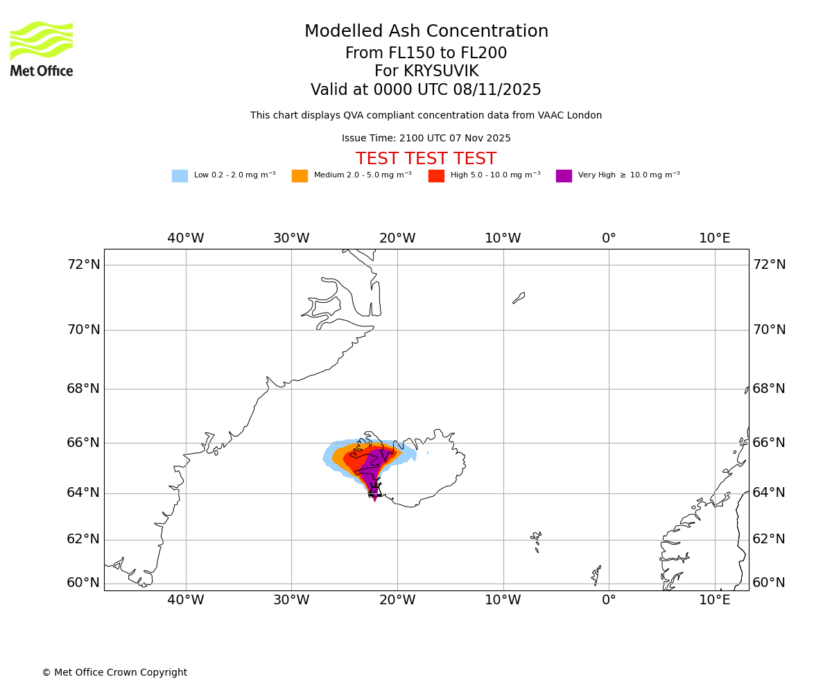 Modelled ash concentration from 150 to 200 for KRYSUVIK. Valid at 2100 UTC 07/11/2025