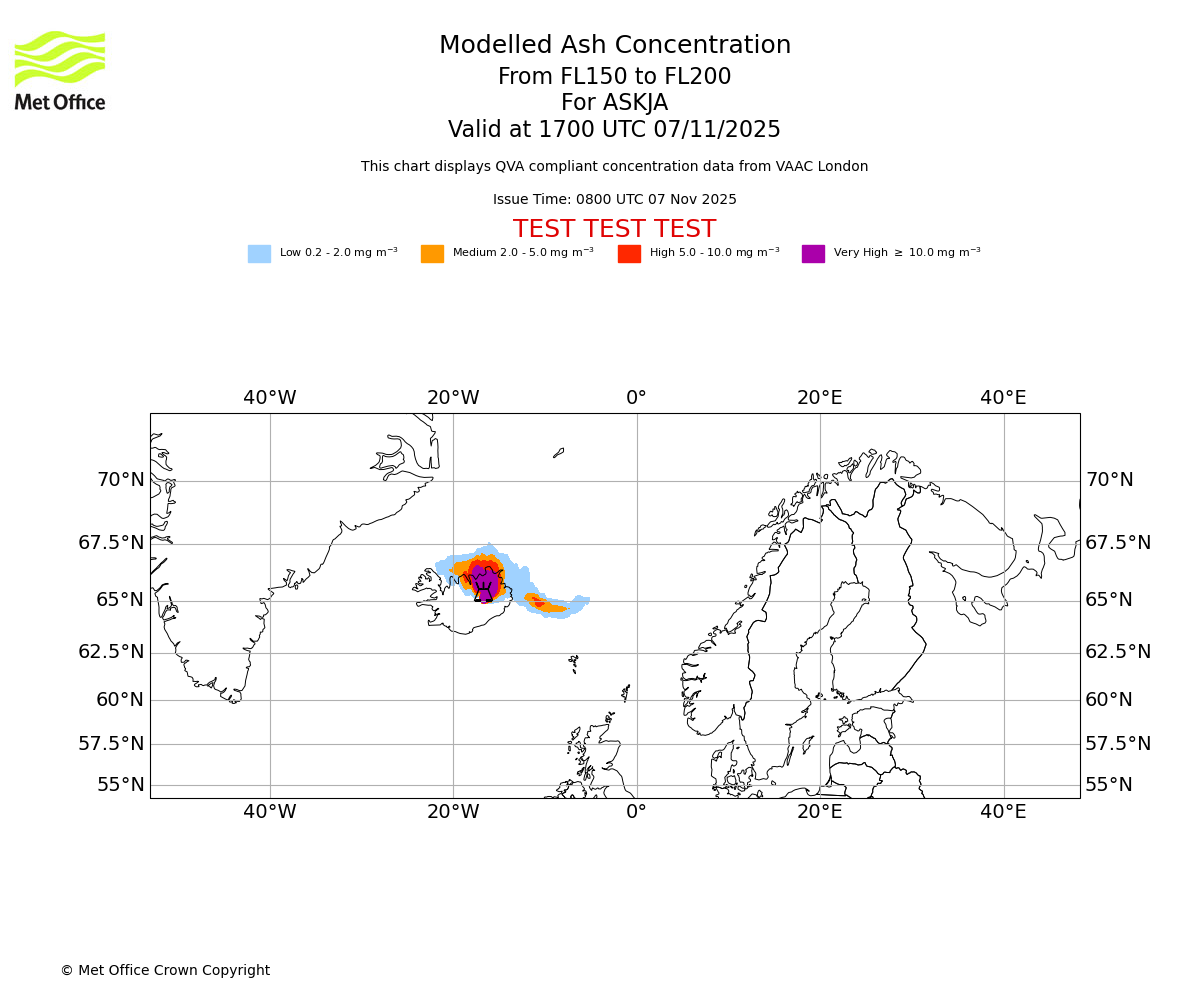 Modelled ash concentration from 150 to 200 for ASKJA. Valid at 1400 UTC 07/11/2025