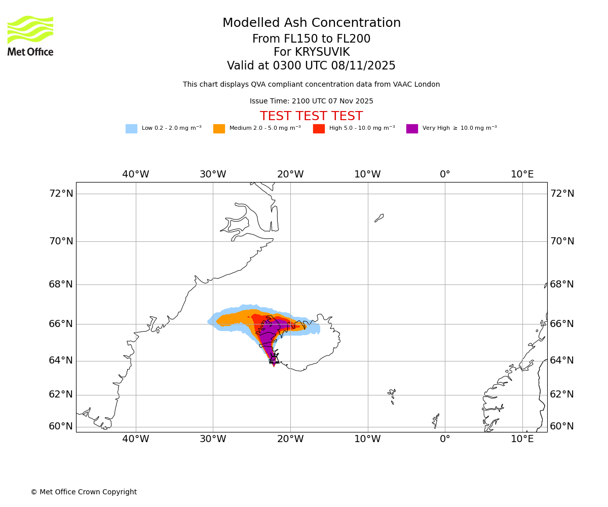 Modelled ash concentration from 150 to 200 for KRYSUVIK. Valid at 0000 UTC 08/11/2025