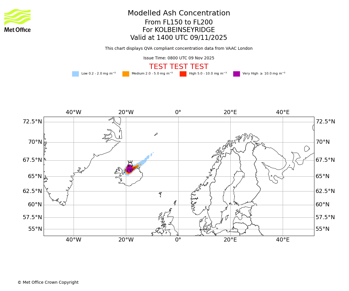 Modelled ash concentration from 150 to 200 for KOLBEINSEYRIDGE. Valid at 1100 UTC 09/11/2025