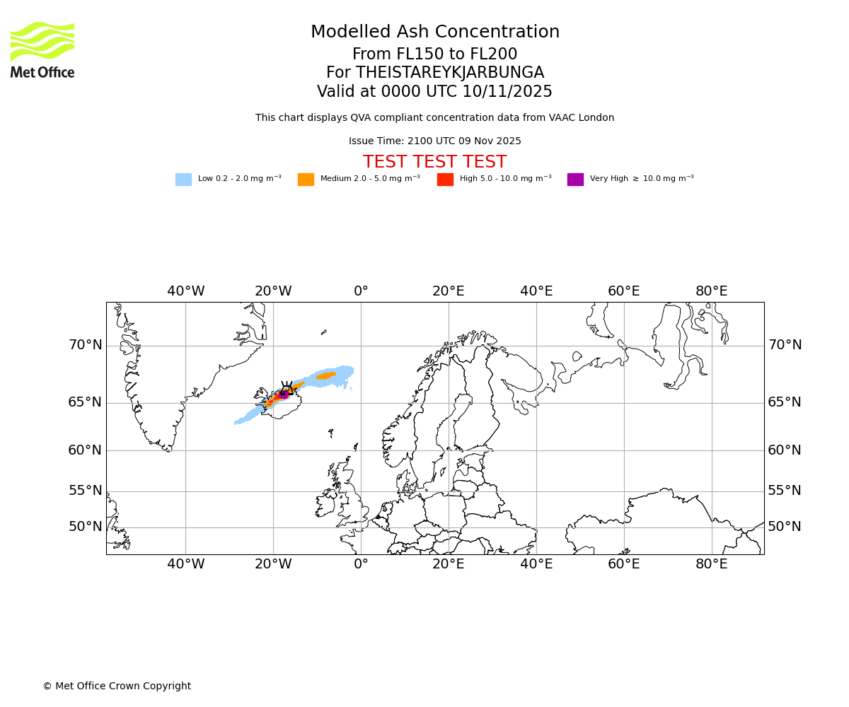In accordance with ICAO Annex 3, Amendment 82 VAAC London will provide operational QVA forecasts from 27 November 2025 and these will be made available via a VAAC London QVA API information service. These charts are currently provided for test and evaluation purposes (not for operational use) until the introduction of the operational service.