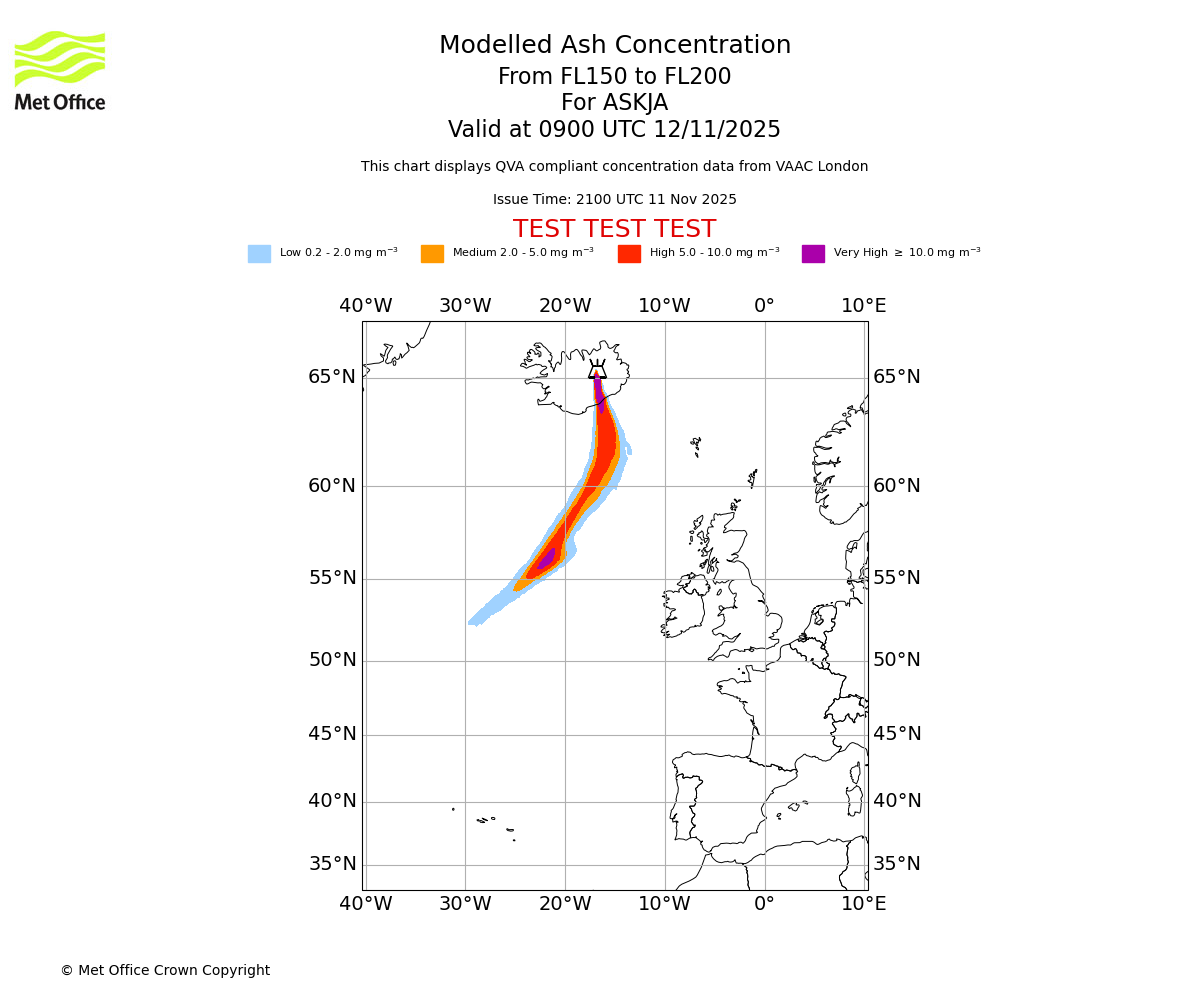 In accordance with ICAO Annex 3, Amendment 82 VAAC London will provide operational QVA forecasts from 27 November 2025 and these will be made available via a VAAC London QVA API information service. These charts are currently provided for test and evaluation purposes (not for operational use) until the introduction of the operational service.