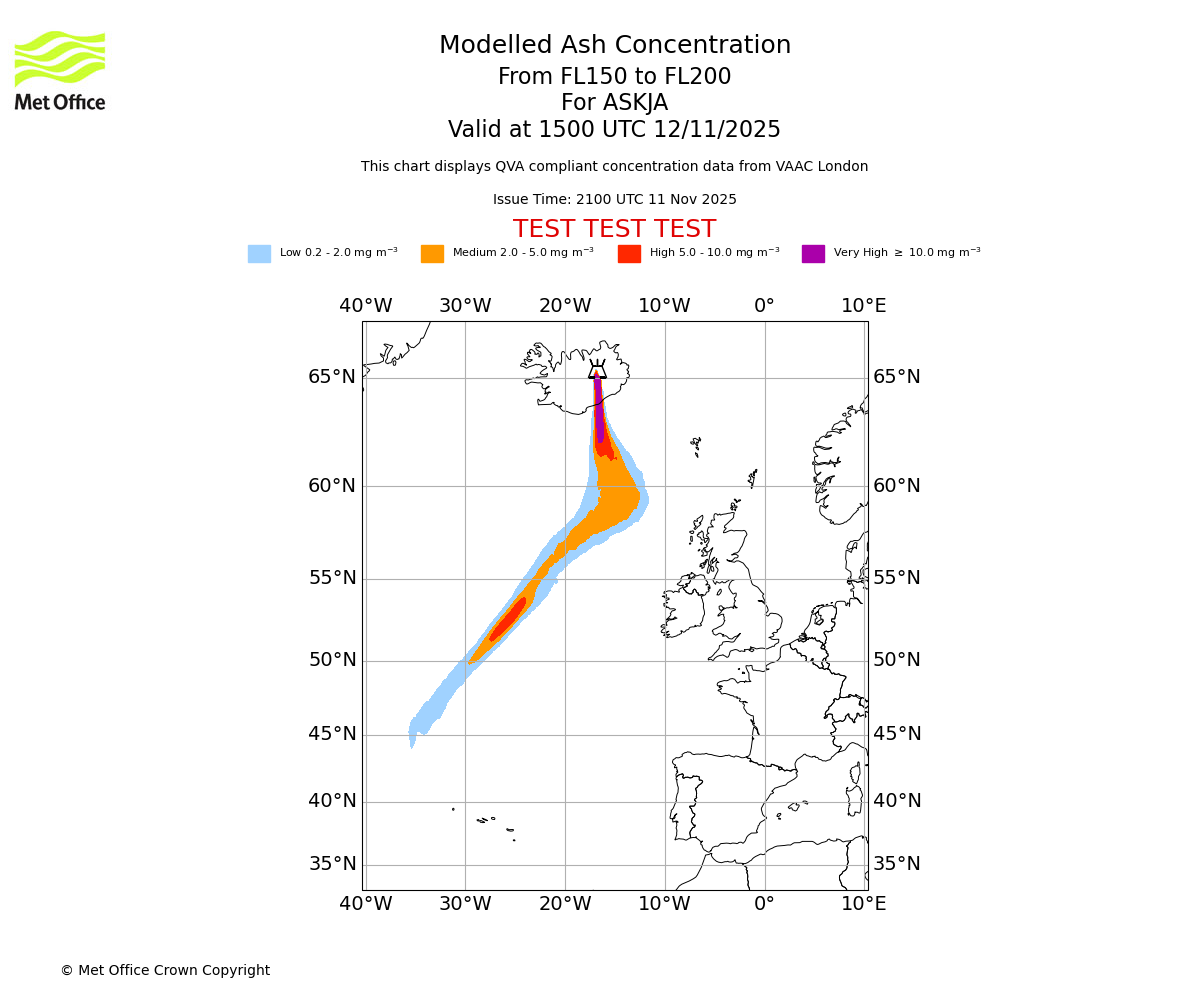 In accordance with ICAO Annex 3, Amendment 82 VAAC London will provide operational QVA forecasts from 27 November 2025 and these will be made available via a VAAC London QVA API information service. These charts are currently provided for test and evaluation purposes (not for operational use) until the introduction of the operational service.