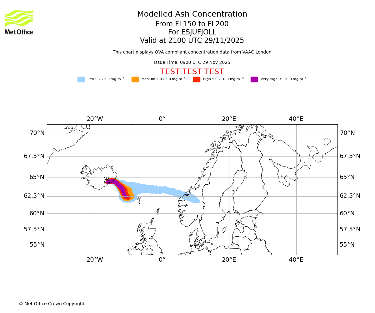 Modelled ash concentration from 000 to 200 for ESJUFJOLL. Valid at 0900 UTC 29/11/2025