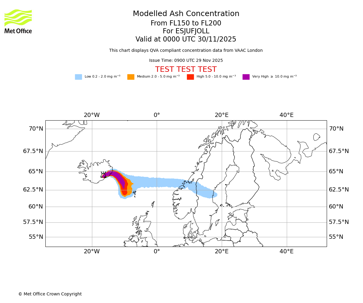 Modelled ash concentration from 000 to 200 for ESJUFJOLL. Valid at 0900 UTC 29/11/2025