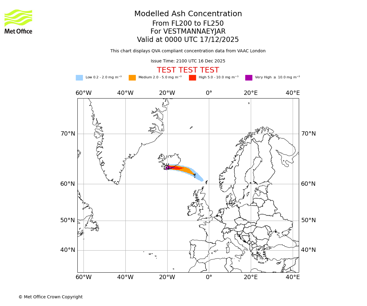 Modelled ash concentration from 000 to 200 for VESTMANNAEYJAR. Valid at 2100 UTC 16/12/2025