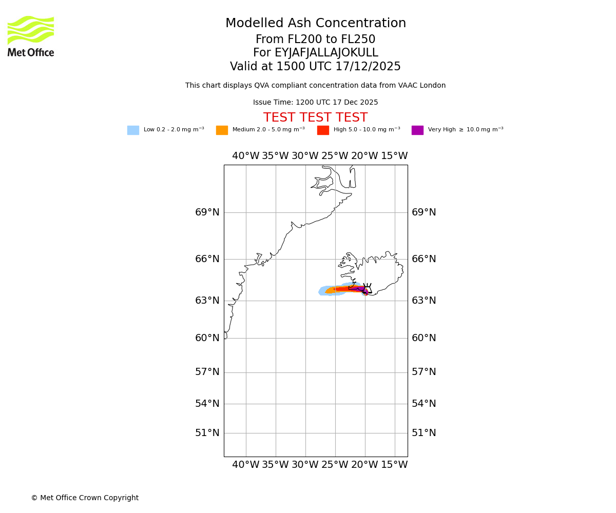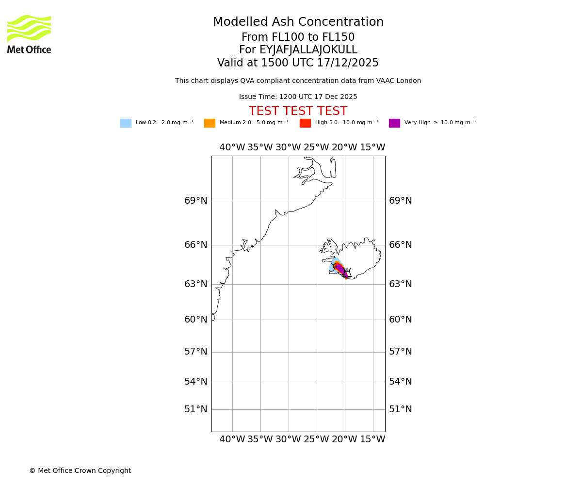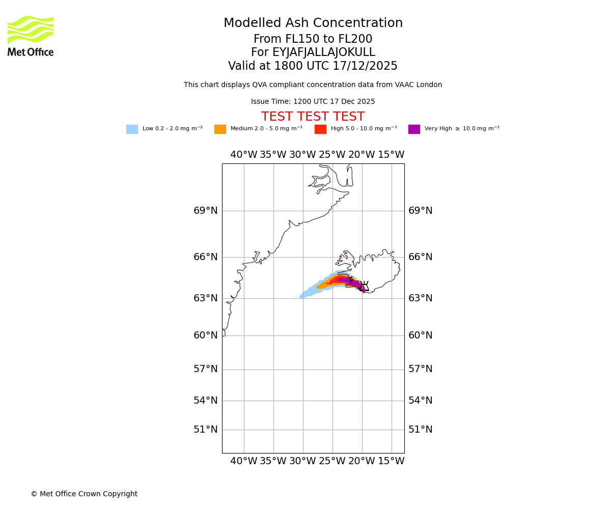 Modelled ash concentration from 150 to 200 for EYJAFJALLAJOKULL. Valid at 1500 UTC 17/12/2025