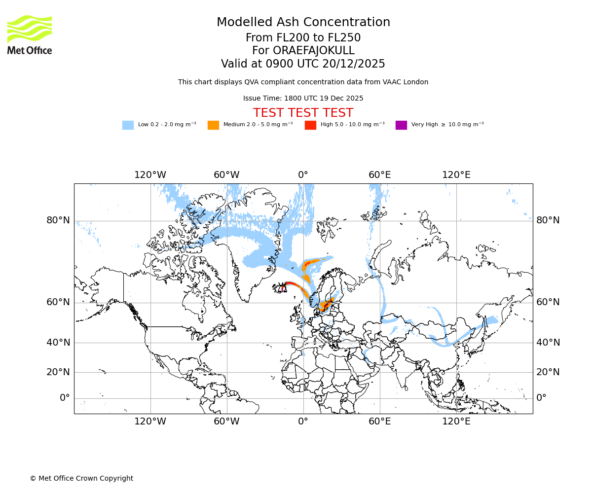 Modelled ash concentration from 150 to 200 for ORAEFAJOKULL. Valid at 0900 UTC 20/12/2025