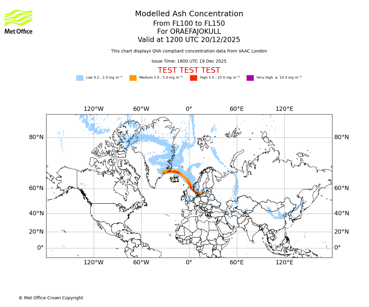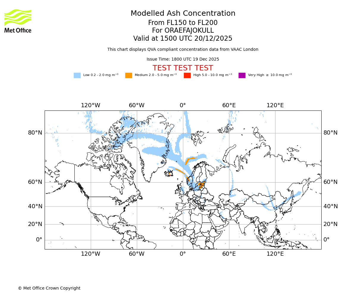 Modelled ash concentration from 150 to 200 for ORAEFAJOKULL. Valid at 1200 UTC 20/12/2025