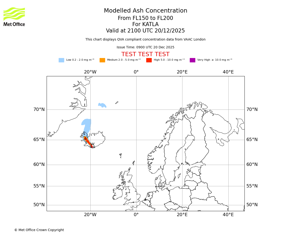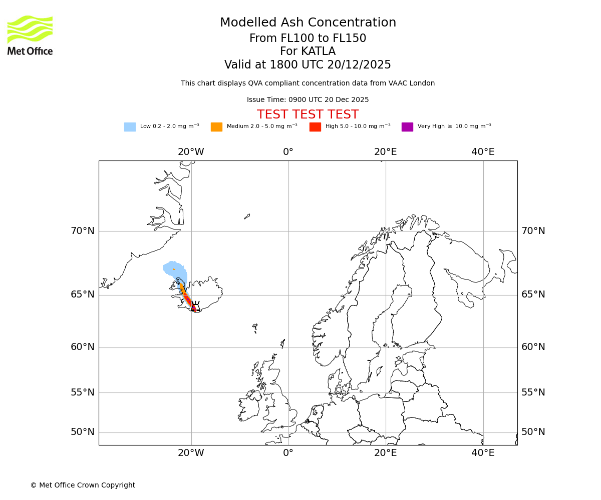 Modelled ash concentration from 150 to 200 for KATLA. Valid at 1800 UTC 20/12/2025
