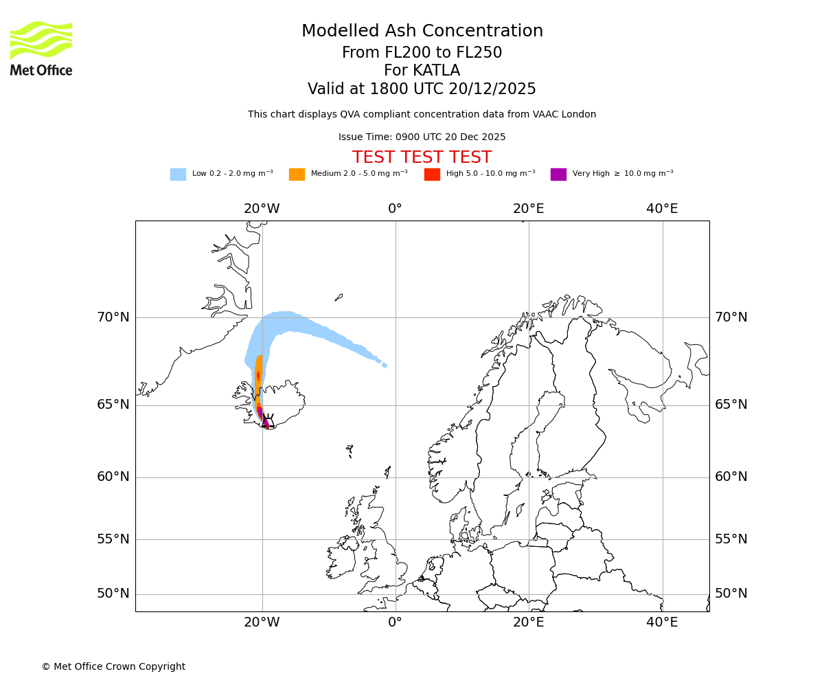 Modelled ash concentration from 000 to 200 for KATLA. Valid at 0900 UTC 20/12/2025