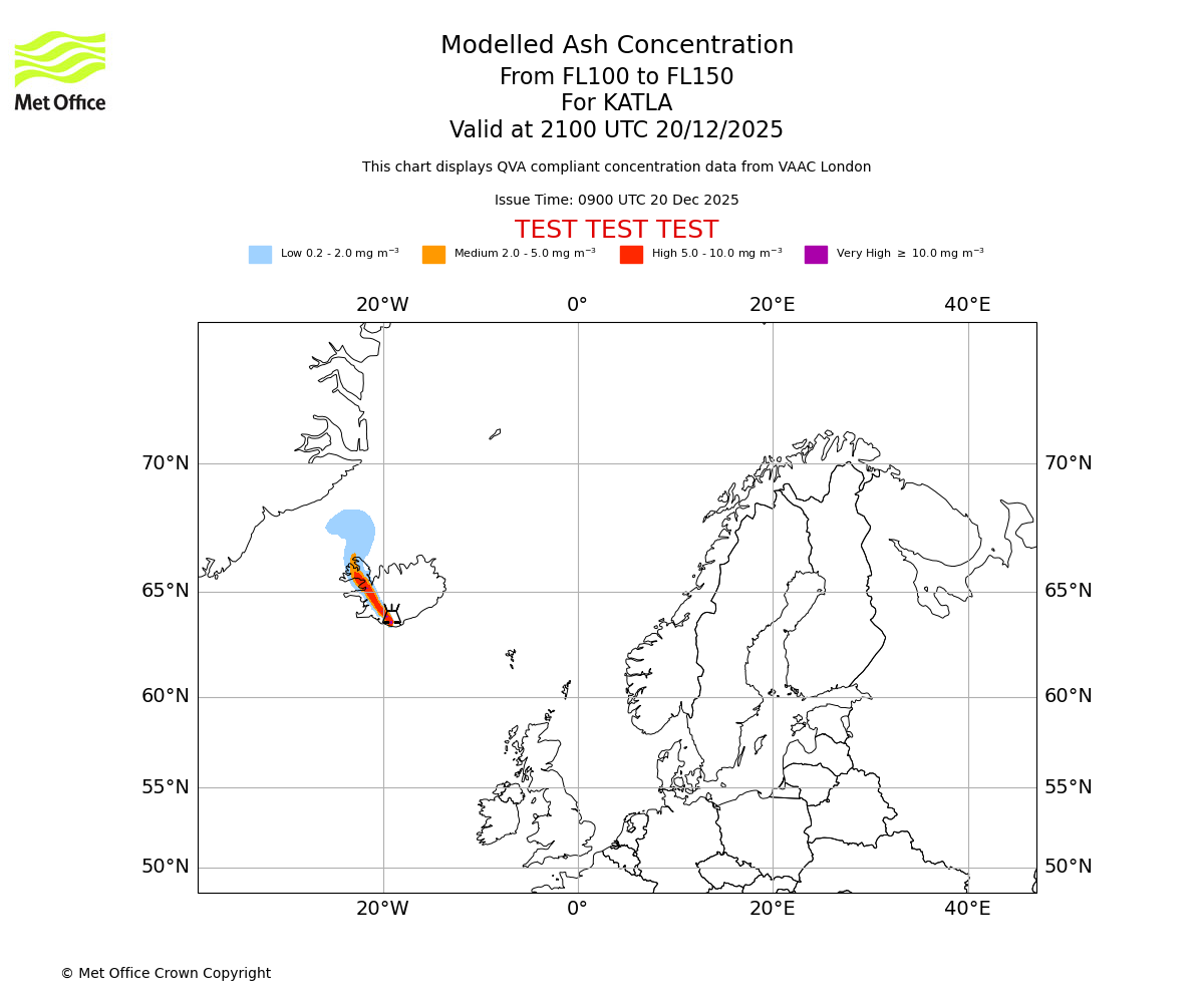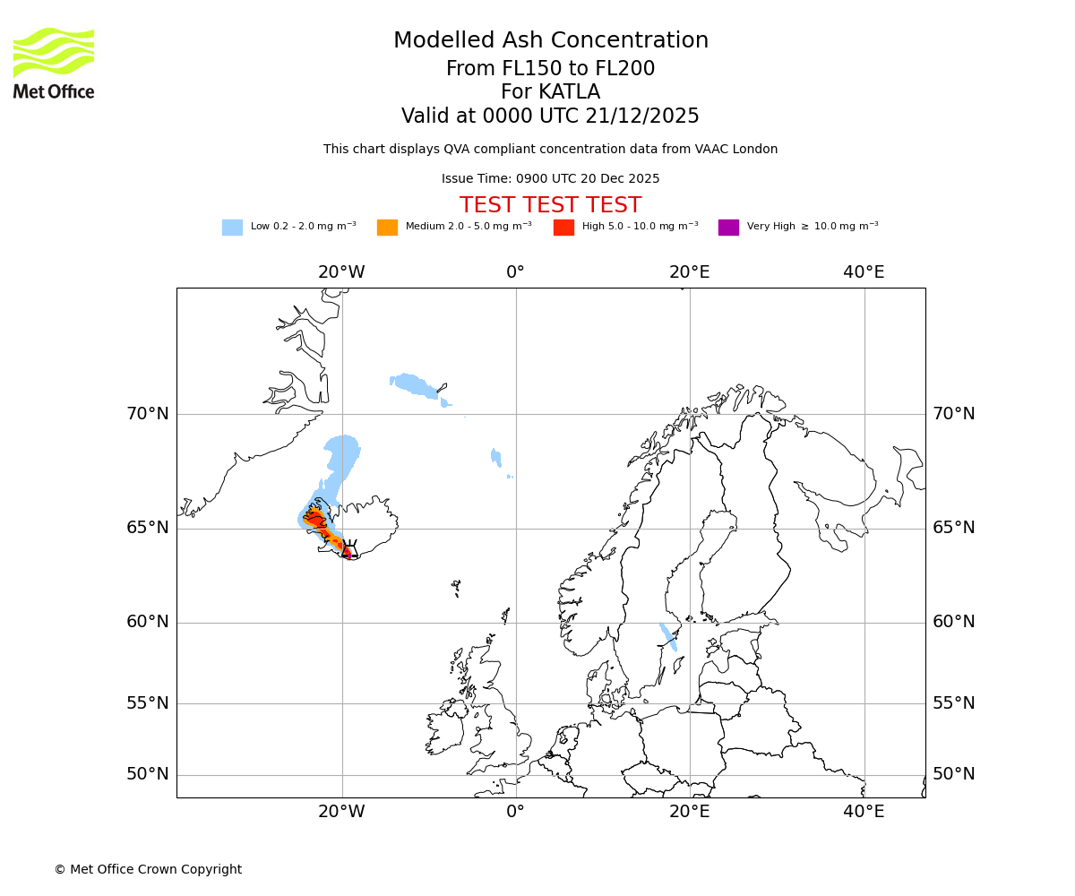 Modelled ash concentration from 150 to 200 for KATLA. Valid at 2100 UTC 20/12/2025