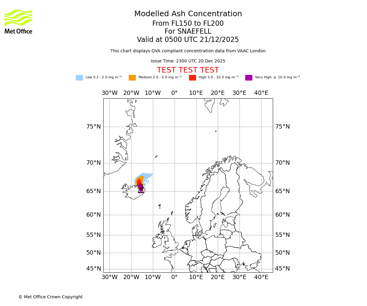 Modelled ash concentration from 150 to 200 for SNAEFELL. Valid at 0200 UTC 21/12/2025
