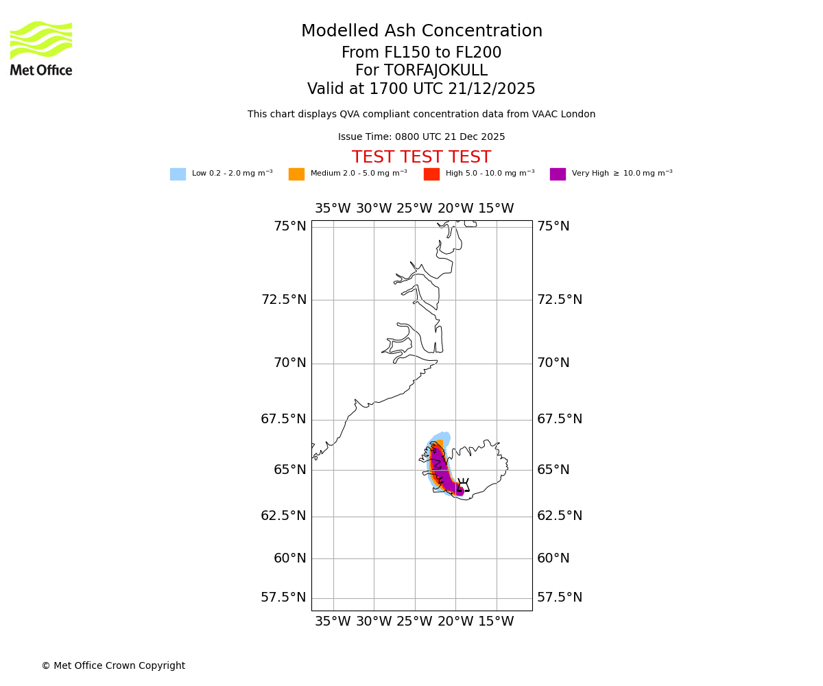 Modelled ash concentration from 150 to 200 for TORFAJOKULL. Valid at 1400 UTC 21/12/2025