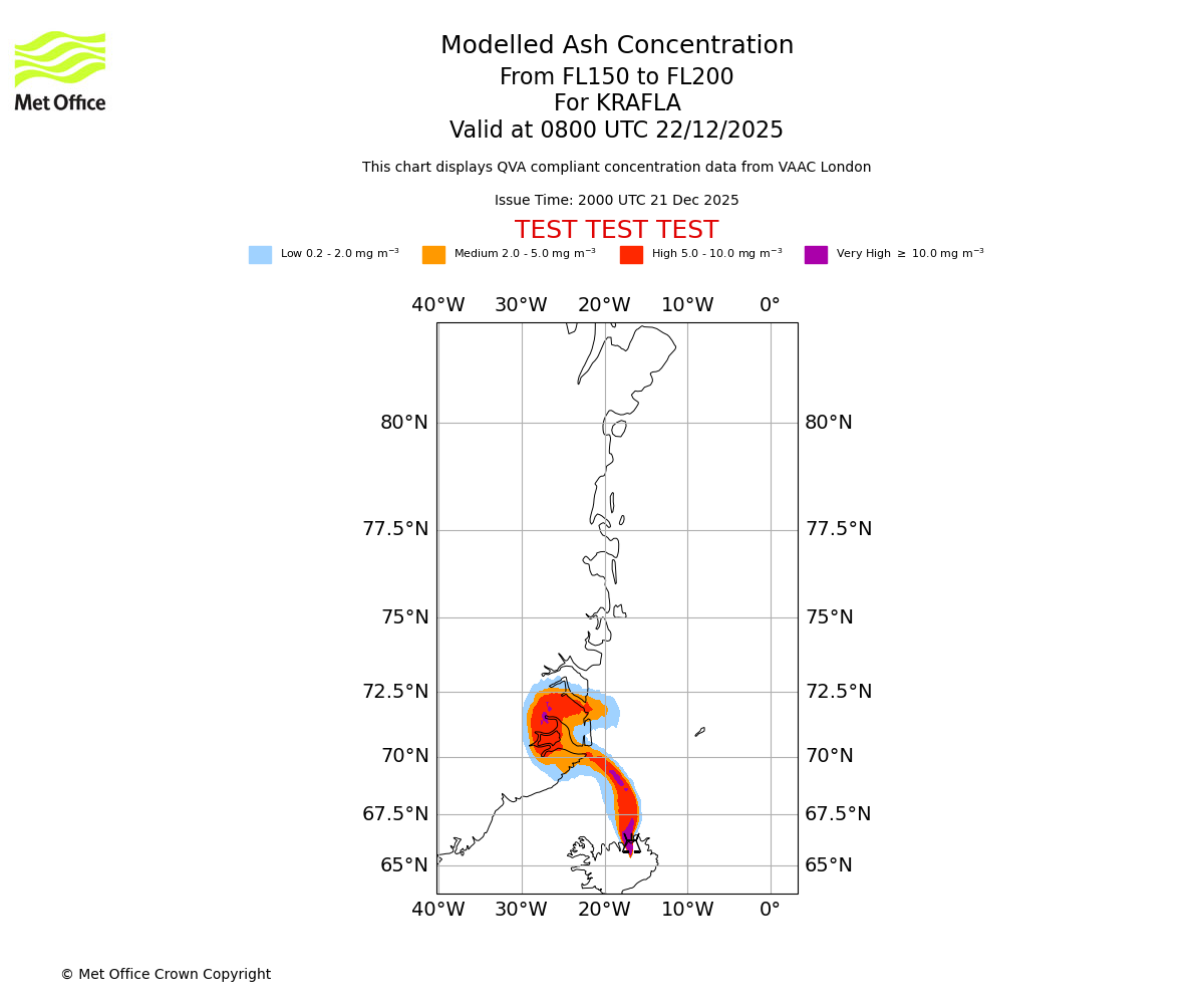Modelled ash concentration from 150 to 200 for KRAFLA. Valid at 0500 UTC 22/12/2025
