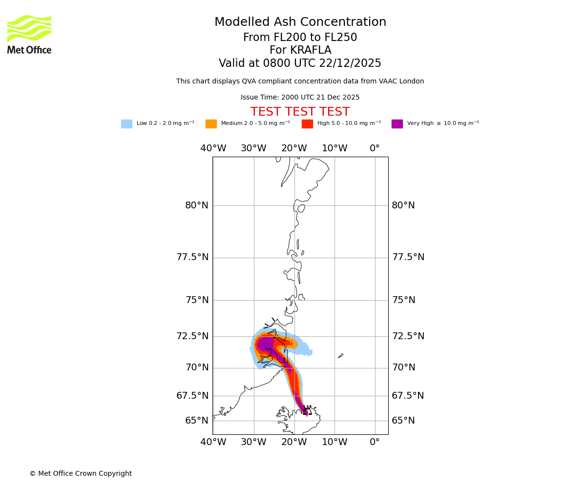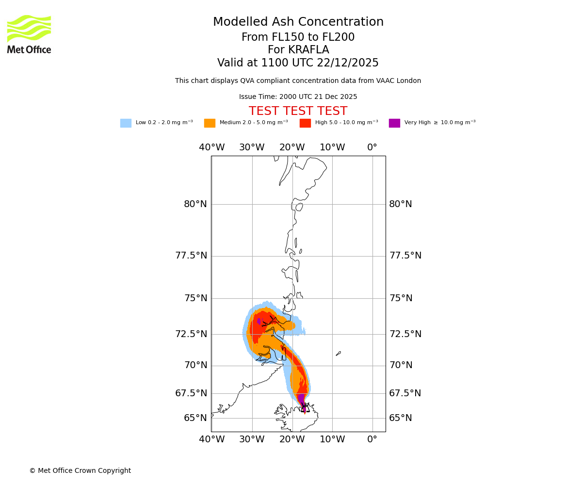 Modelled ash concentration from 150 to 200 for KRAFLA. Valid at 0800 UTC 22/12/2025