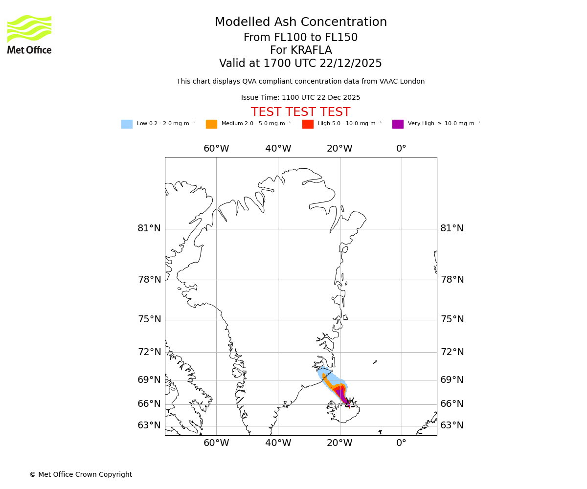 Modelled ash concentration from 150 to 200 for KRAFLA. Valid at 1700 UTC 22/12/2025