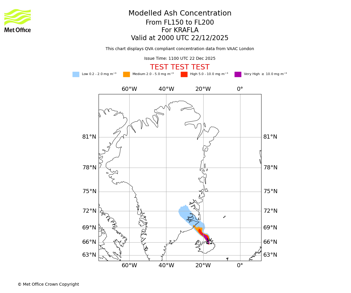 Modelled ash concentration from 000 to 200 for KRAFLA. Valid at 1100 UTC 22/12/2025