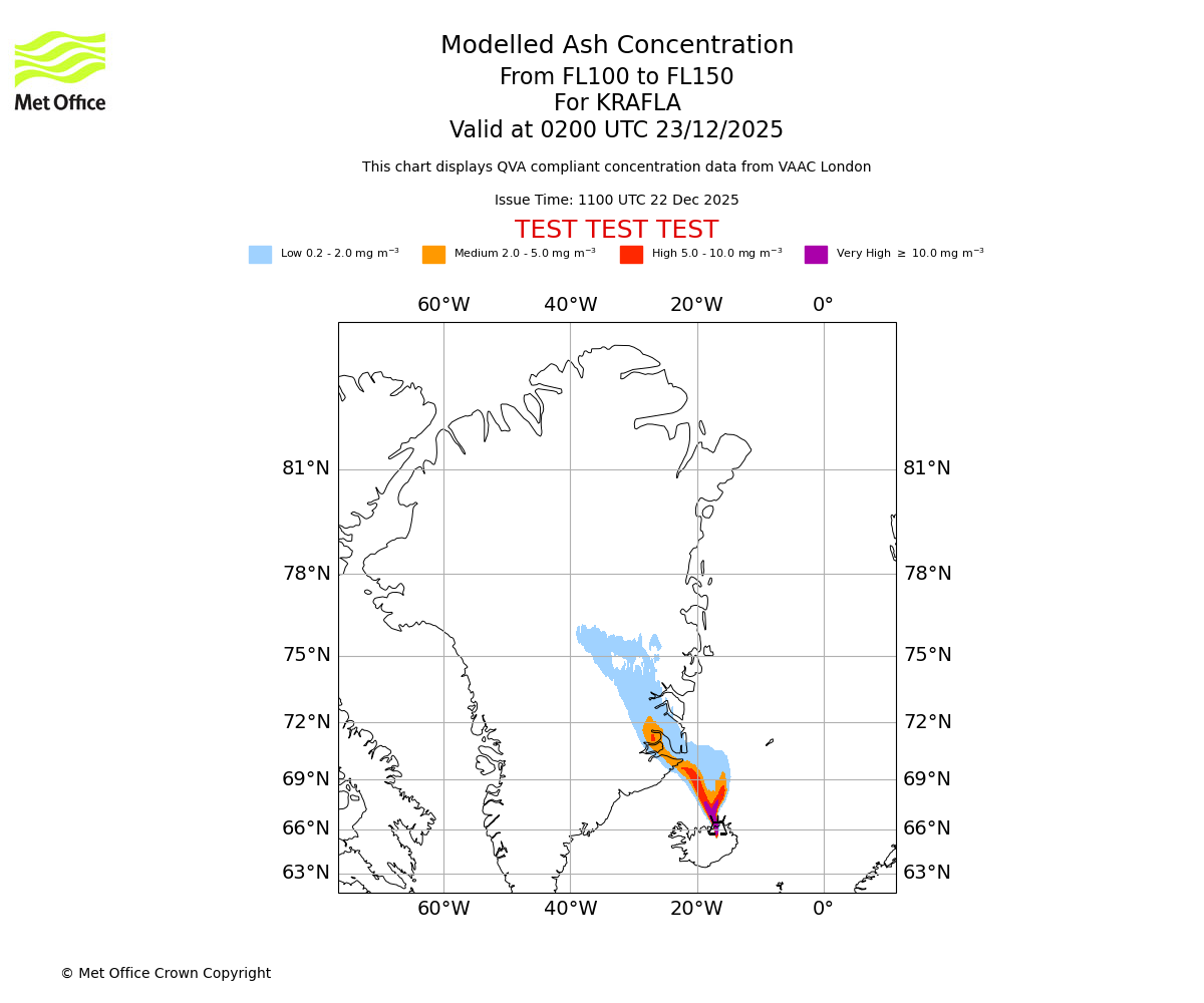 Modelled ash concentration from 150 to 200 for KRAFLA. Valid at 0200 UTC 23/12/2025