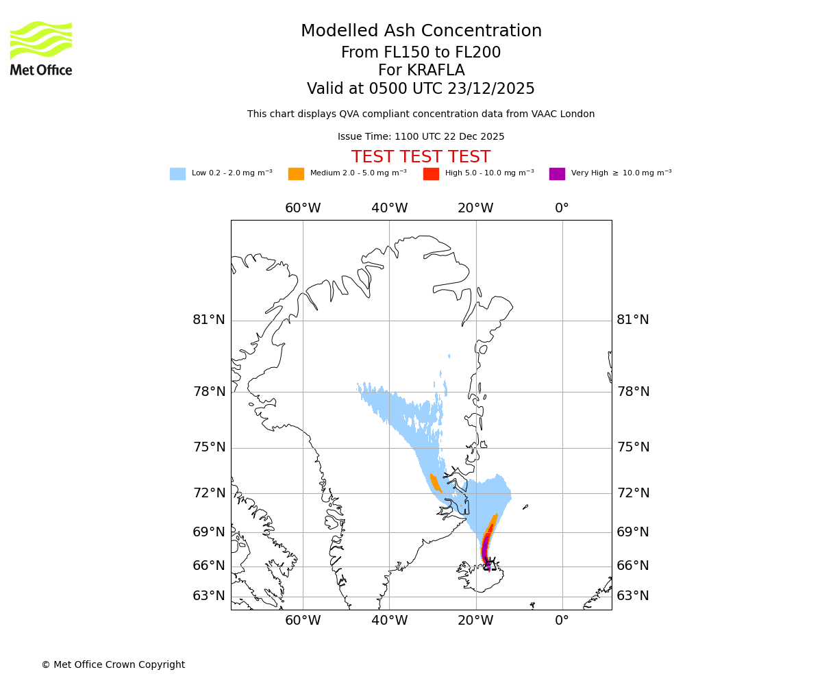 Modelled ash concentration from 000 to 200 for KRAFLA. Valid at 1100 UTC 22/12/2025