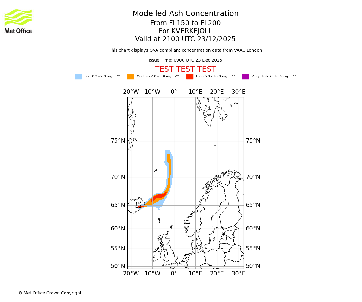 Modelled ash concentration from 150 to 200 for KVERKFJOLL. Valid at 1800 UTC 23/12/2025