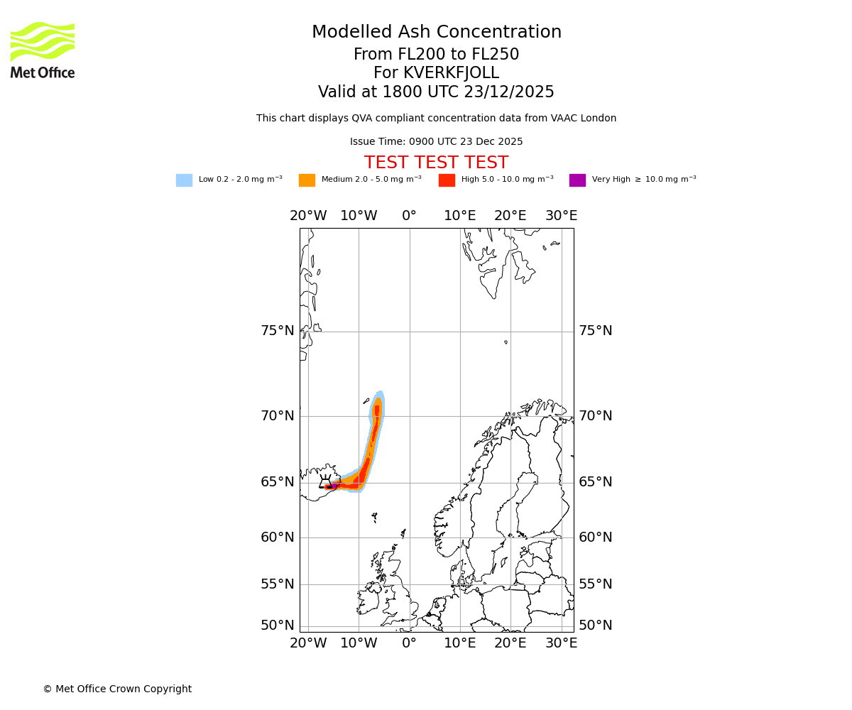 Modelled ash concentration from 000 to 200 for KVERKFJOLL. Valid at 0900 UTC 23/12/2025