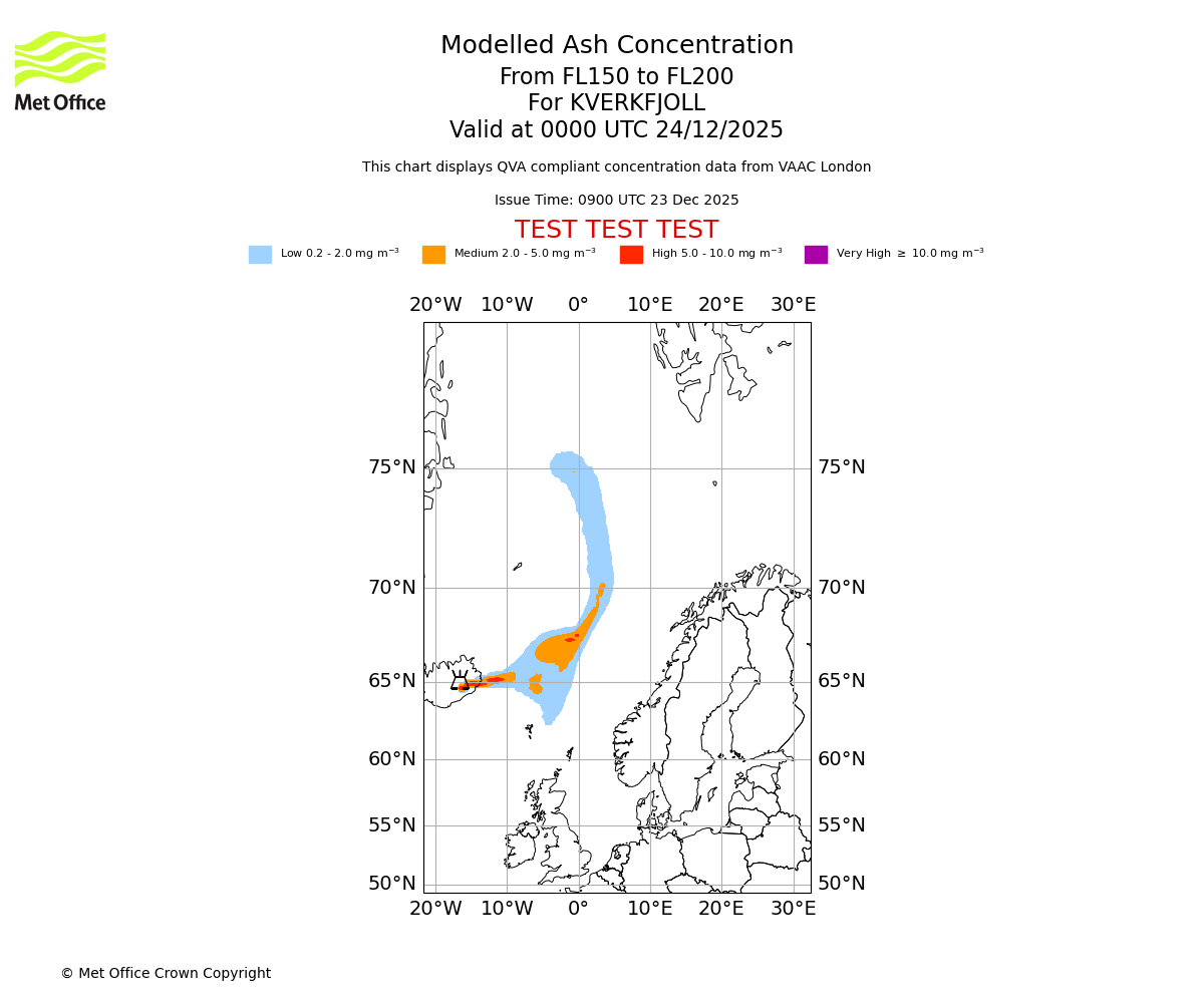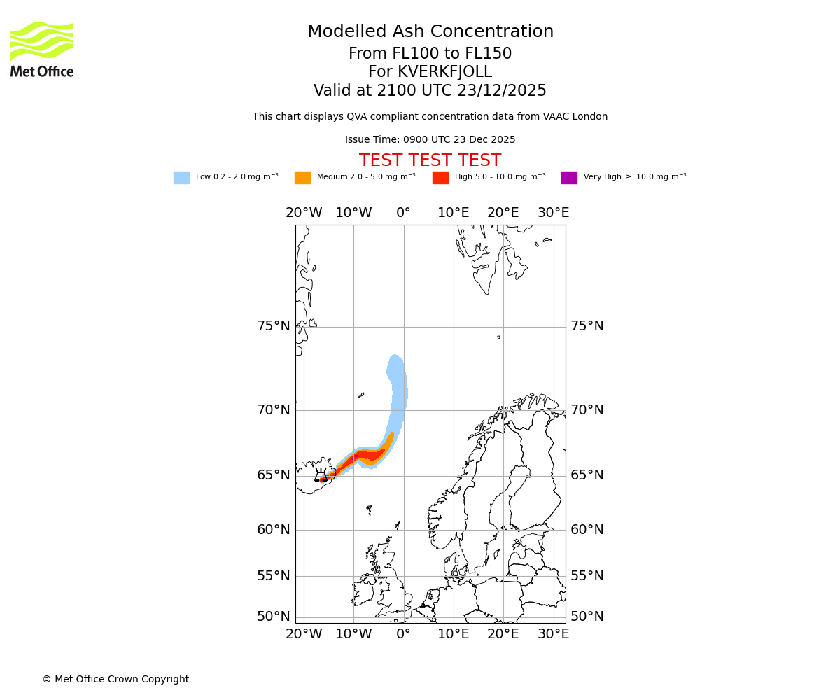 Modelled ash concentration from 150 to 200 for KVERKFJOLL. Valid at 2100 UTC 23/12/2025