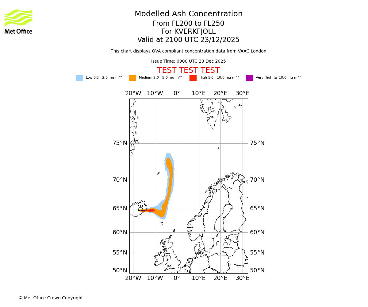 Modelled ash concentration from 000 to 200 for KVERKFJOLL. Valid at 0900 UTC 23/12/2025