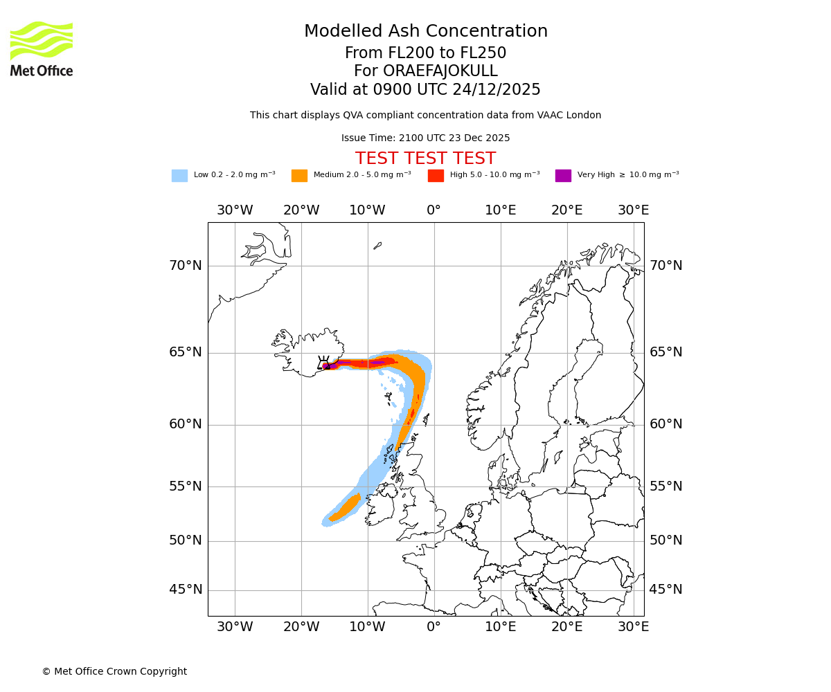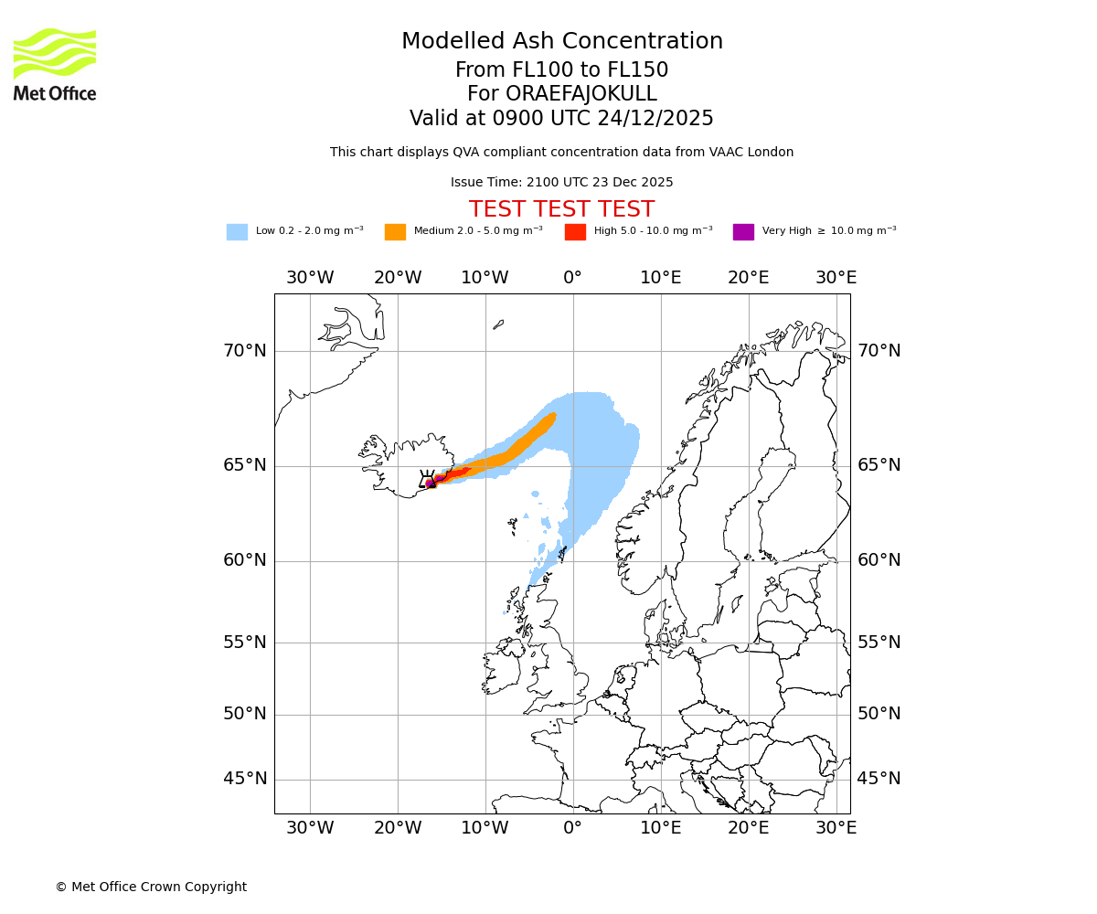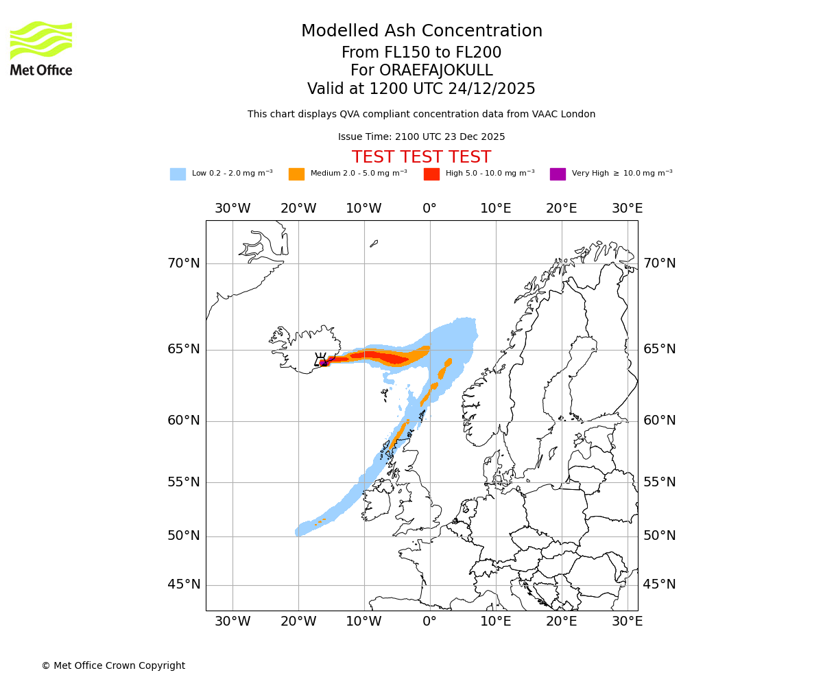 Modelled ash concentration from 150 to 200 for ORAEFAJOKULL. Valid at 0900 UTC 24/12/2025