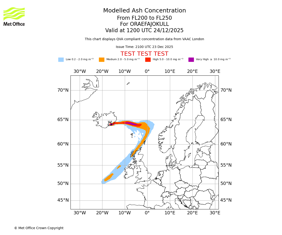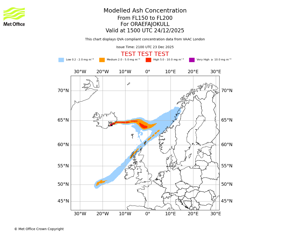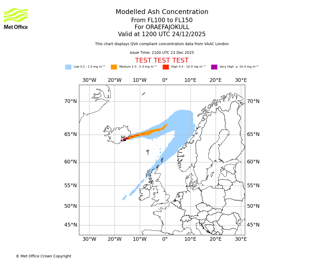 Modelled ash concentration from 150 to 200 for ORAEFAJOKULL. Valid at 1200 UTC 24/12/2025