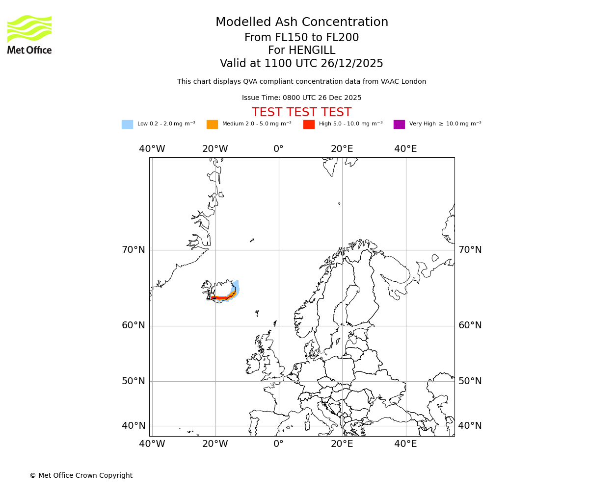 Modelled ash concentration from 150 to 200 for HENGILL. Valid at 0800 UTC 26/12/2025