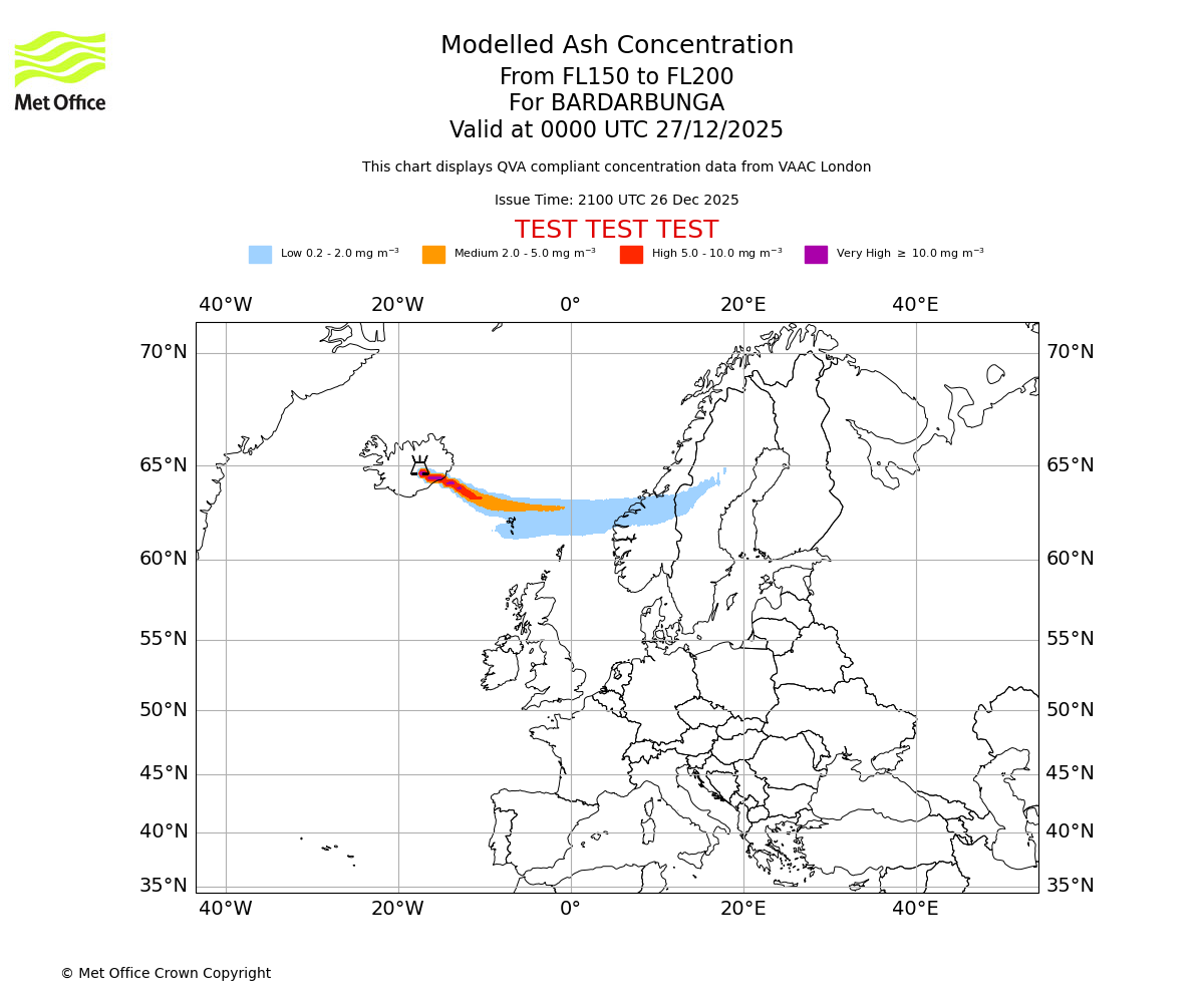 Modelled ash concentration from 150 to 200 for BARDARBUNGA. Valid at 2100 UTC 26/12/2025