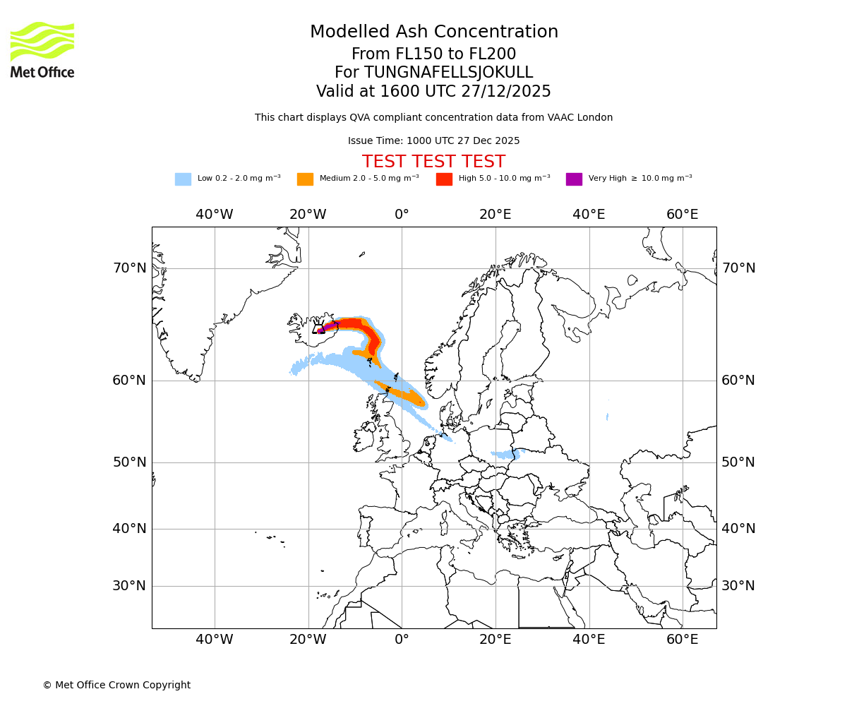 Modelled ash concentration from 150 to 200 for TUNGNAFELLSJOKULL. Valid at 1300 UTC 27/12/2025