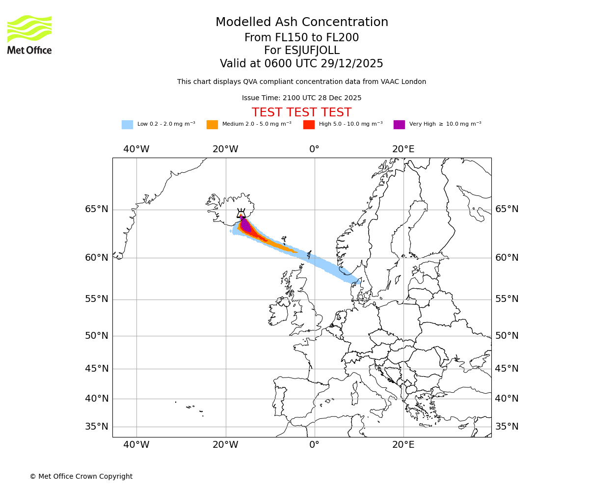 Modelled ash concentration from 150 to 200 for ESJUFJOLL. Valid at 0300 UTC 29/12/2025