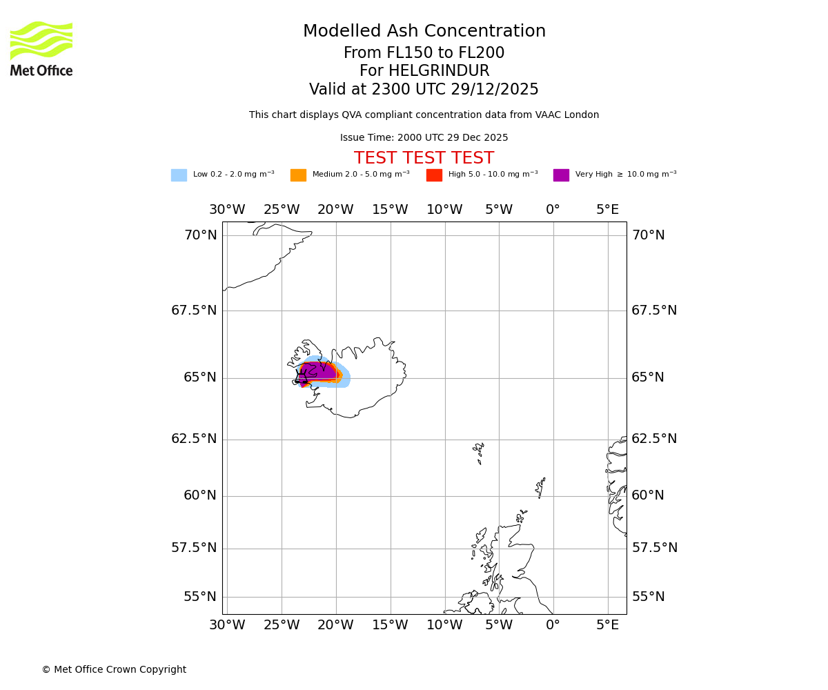 Modelled ash concentration from 150 to 200 for HELGRINDUR. Valid at 2000 UTC 29/12/2025