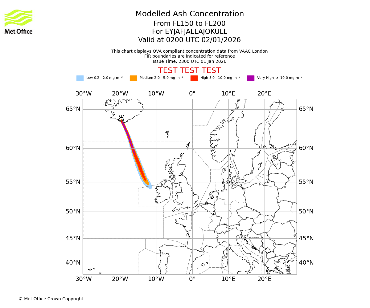 Modelled ash concentration from 150 to 200 for EYJAFJALLAJOKULL. Valid at 2300 UTC 01/01/2026