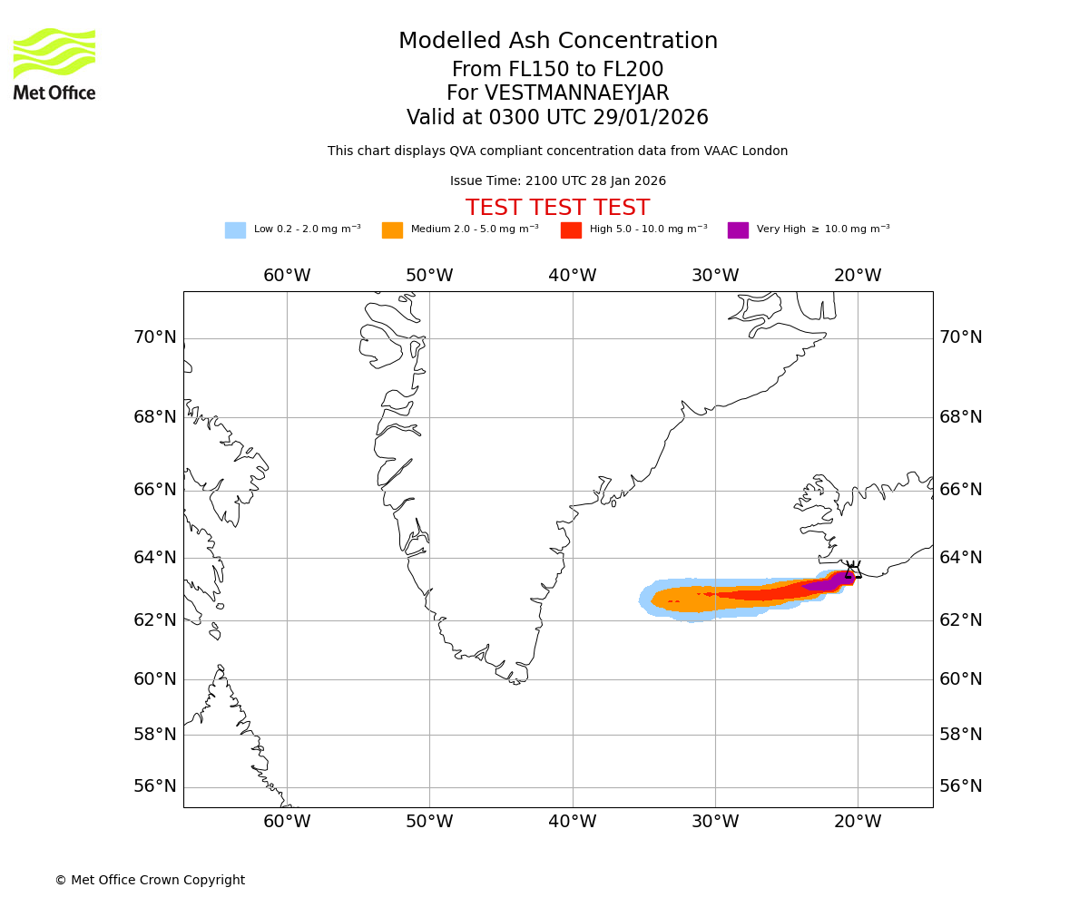 Modelled ash concentration from 150 to 200 for VESTMANNAEYJAR. Valid at 0000 UTC 29/01/2026