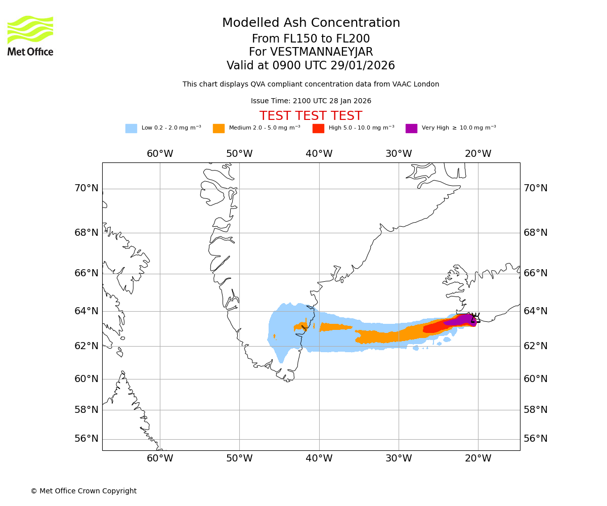 Modelled ash concentration from 150 to 200 for VESTMANNAEYJAR. Valid at 0600 UTC 29/01/2026
