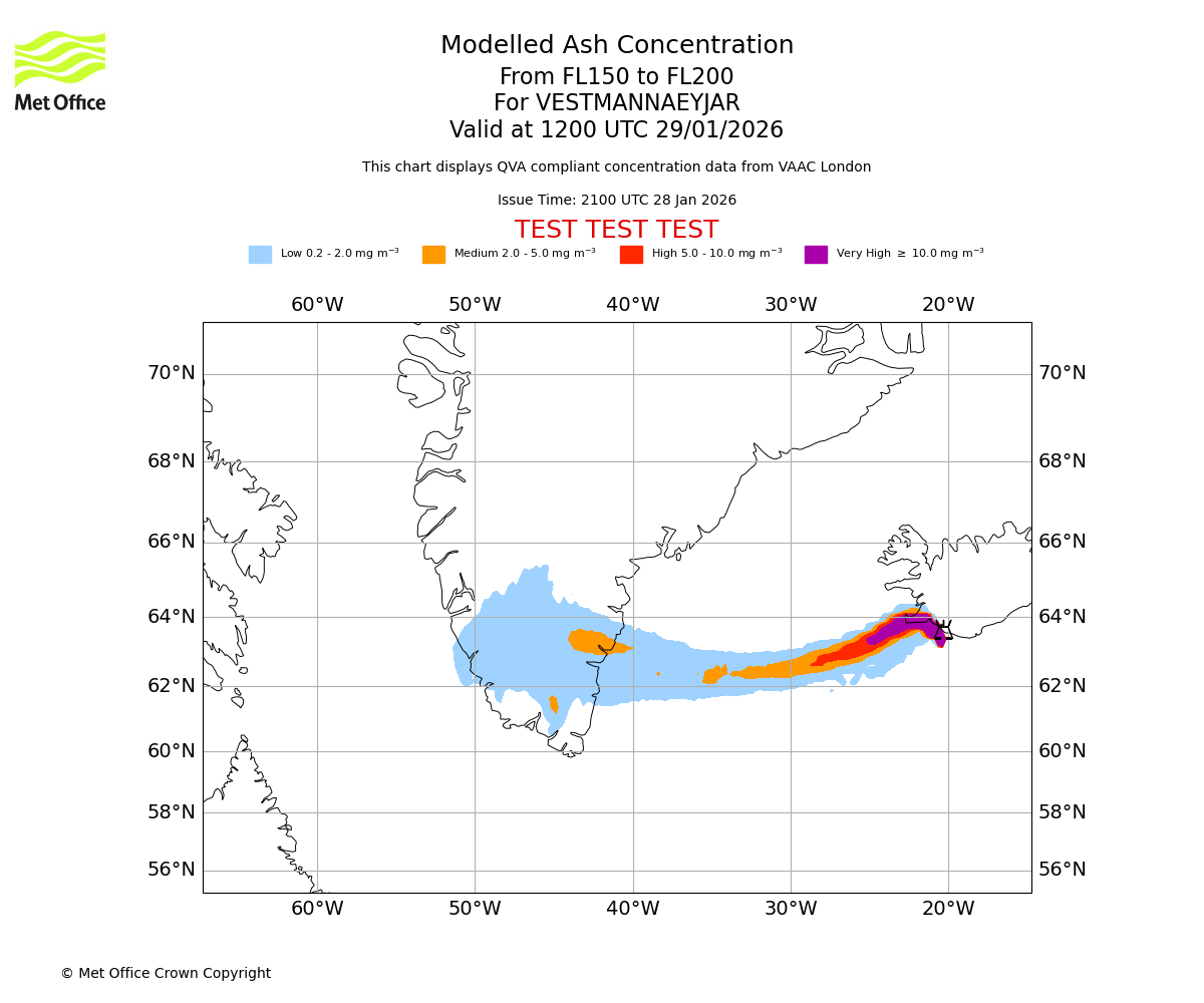 Modelled ash concentration from 150 to 200 for VESTMANNAEYJAR. Valid at 0900 UTC 29/01/2026