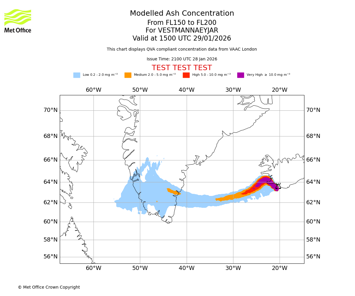 Modelled ash concentration from 150 to 200 for VESTMANNAEYJAR. Valid at 1200 UTC 29/01/2026