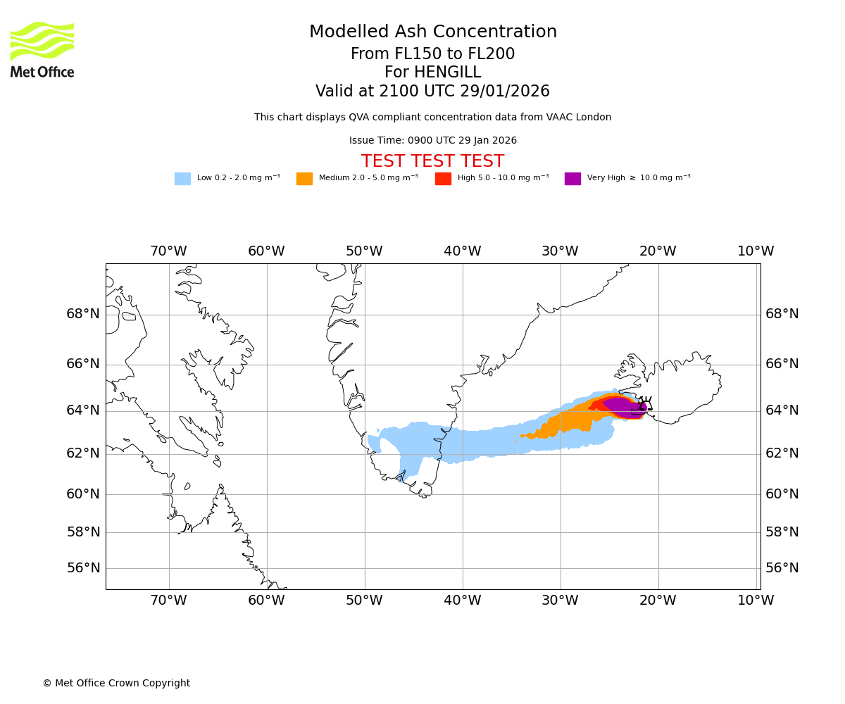 Modelled ash concentration from 150 to 200 for HENGILL. Valid at 1800 UTC 29/01/2026