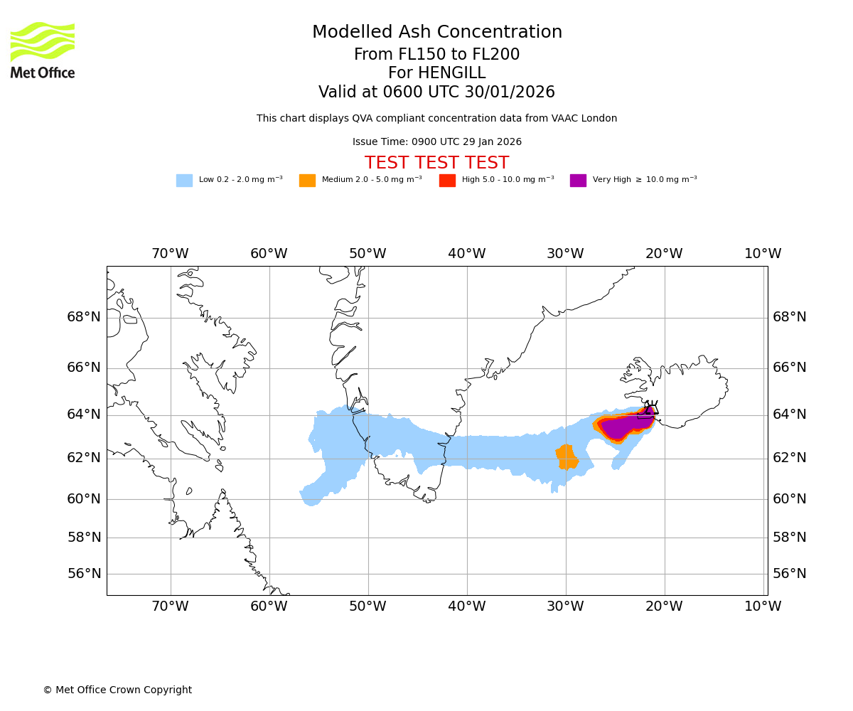 Modelled ash concentration from 150 to 200 for HENGILL. Valid at 0300 UTC 30/01/2026