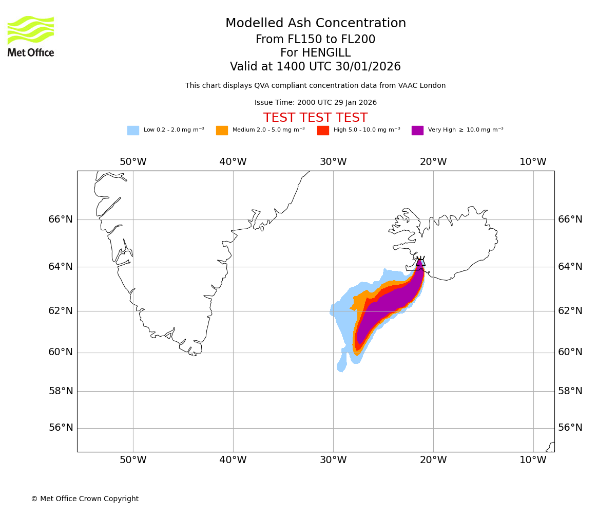 Modelled ash concentration from 150 to 200 for HENGILL. Valid at 1100 UTC 30/01/2026