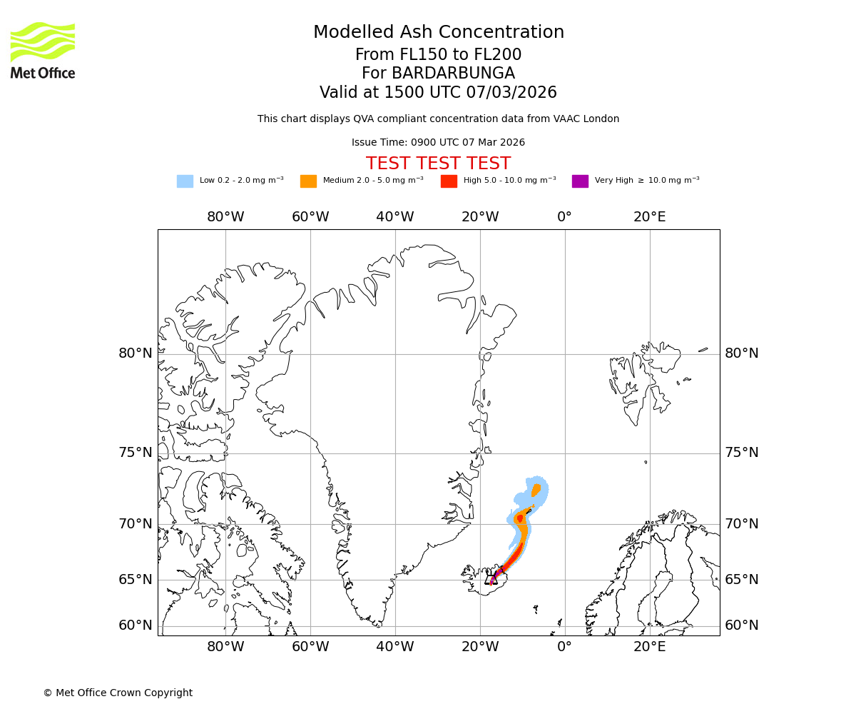 Modelled ash concentration from 150 to 200 for BARDARBUNGA. Valid at 1200 UTC 07/03/2026