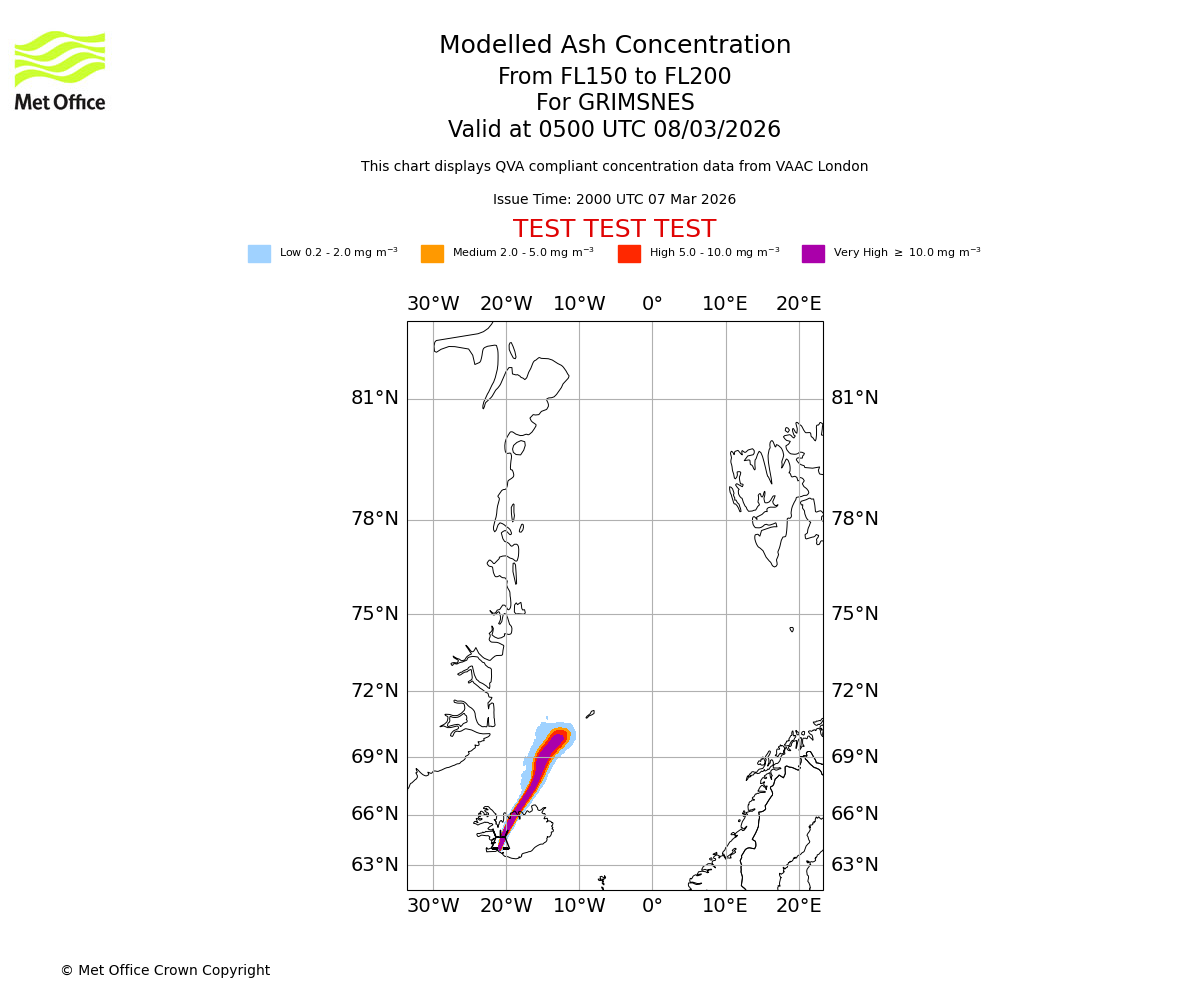Modelled ash concentration from 000 to 200 for GRIMSNES. Valid at 2000 UTC 07/03/2026