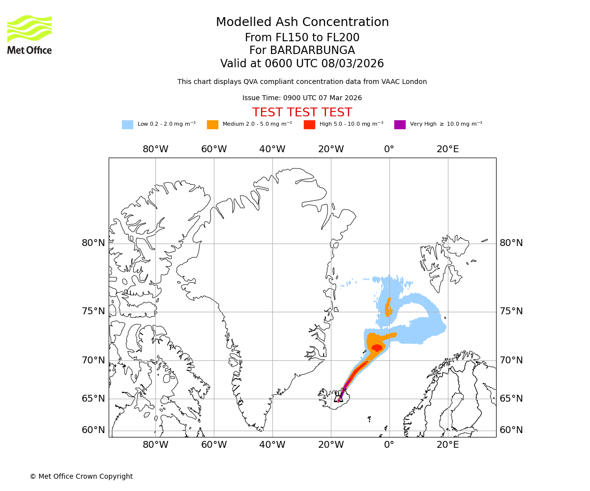 Modelled ash concentration from 000 to 200 for BARDARBUNGA. Valid at 0900 UTC 07/03/2026