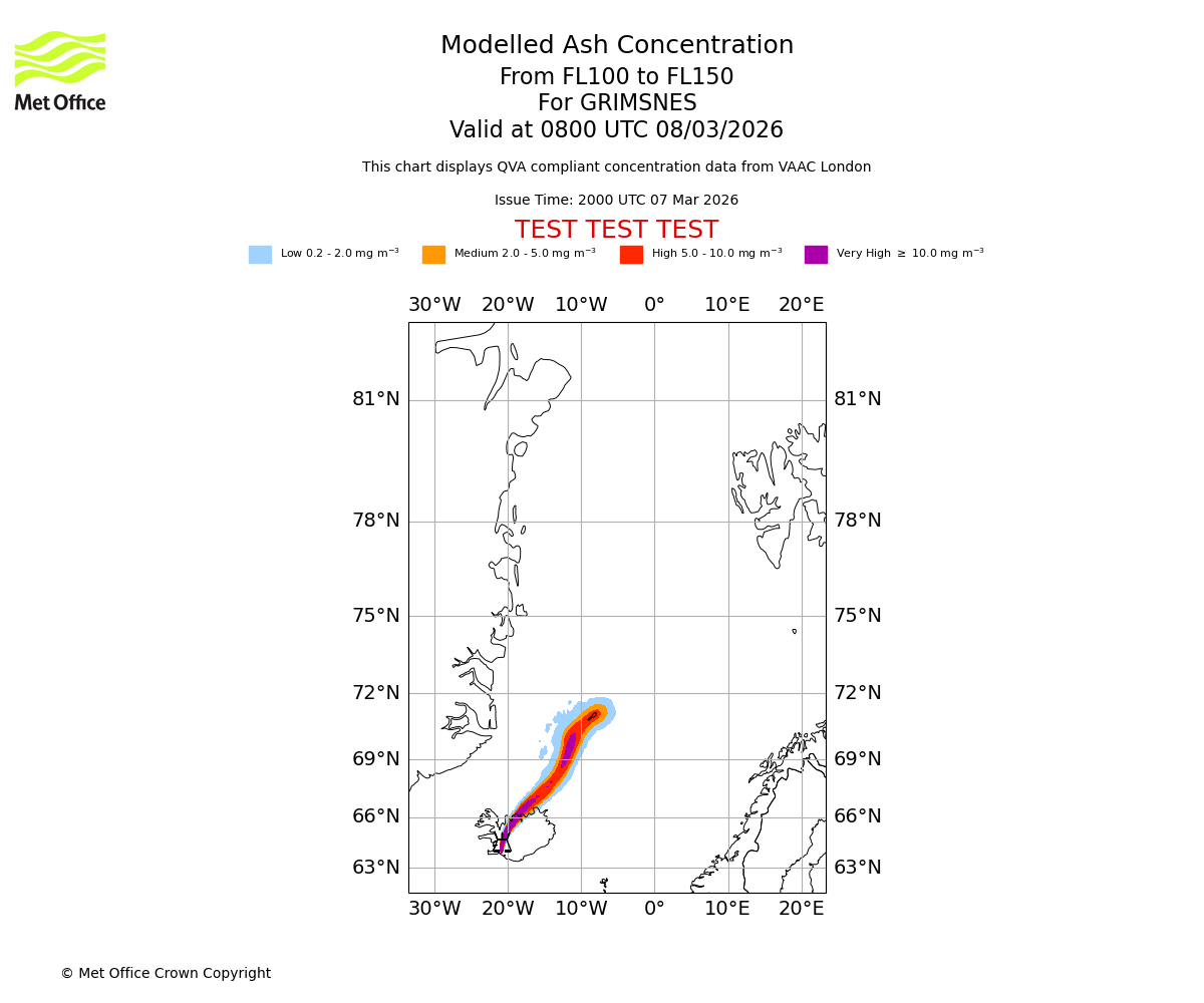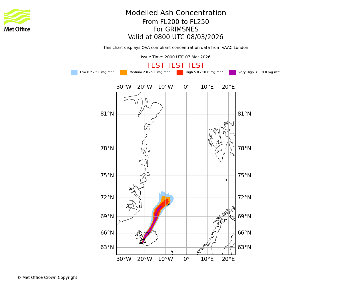 Modelled ash concentration from 000 to 200 for GRIMSNES. Valid at 2000 UTC 07/03/2026