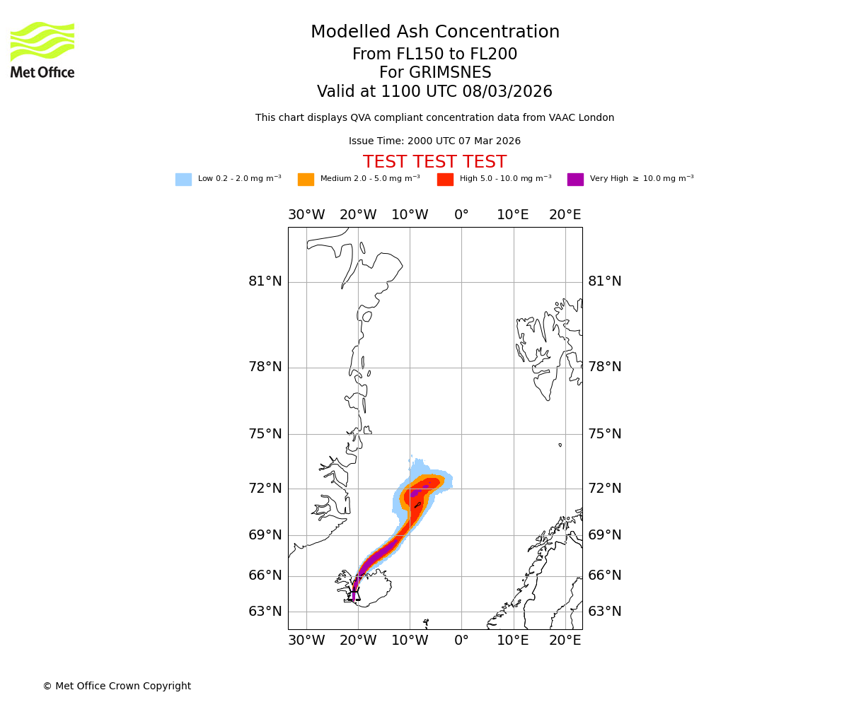 Modelled ash concentration from 150 to 200 for GRIMSNES. Valid at 0800 UTC 08/03/2026