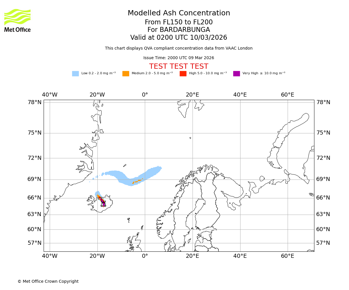 Modelled ash concentration from 150 to 200 for BARDARBUNGA. Valid at 2300 UTC 09/03/2026