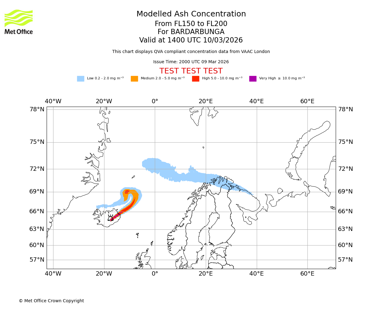 Modelled ash concentration from 150 to 200 for BARDARBUNGA. Valid at 1100 UTC 10/03/2026